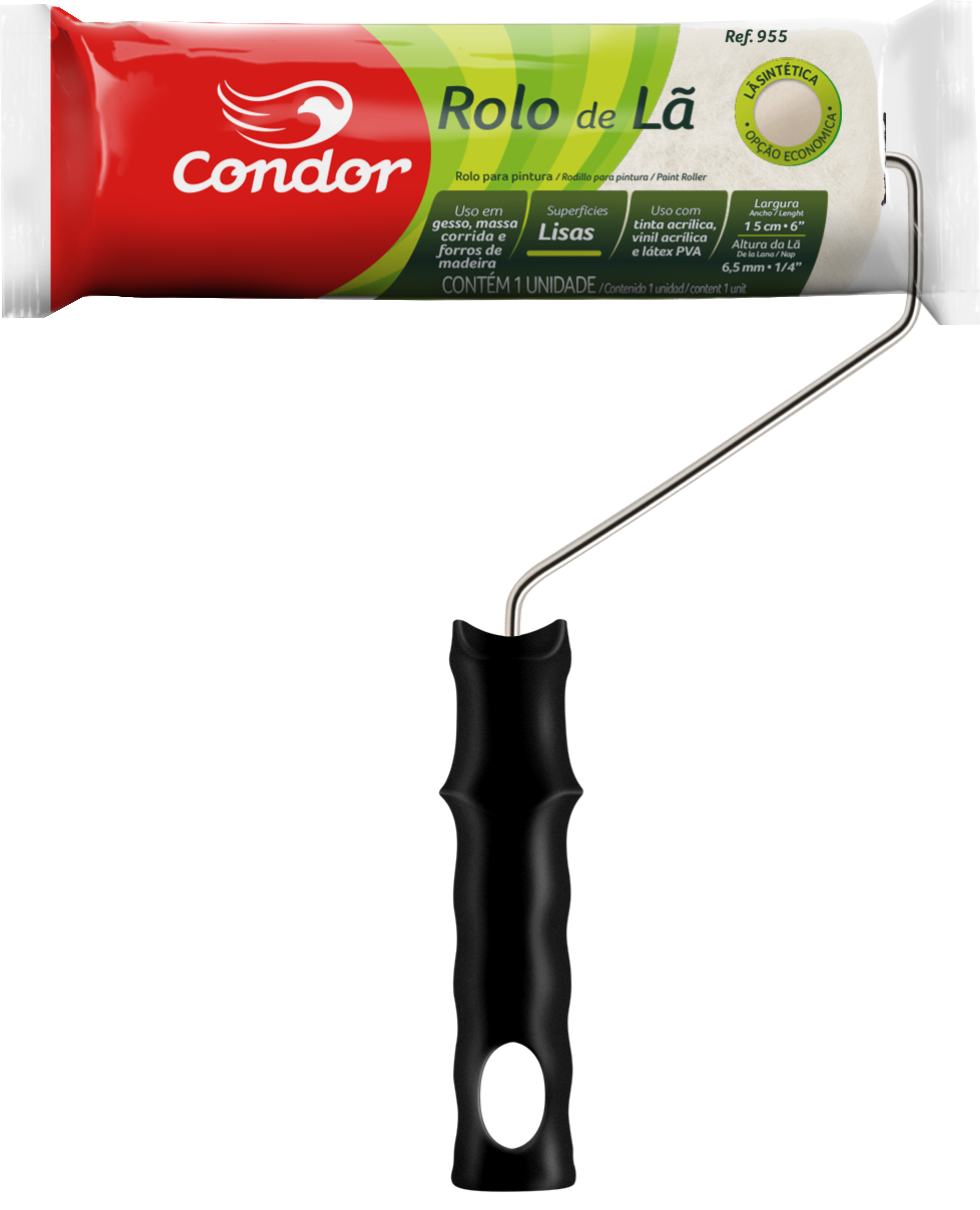 Rolo econômico de lã sintética. ALTURA DA LÃ: 18 mm (Tamanho 23 cm) e 6,5 mm (Tamanho 5, 9 e 15 cm). INDICAÇÃO DE PINTURA: Indicado para superfícies lisas.