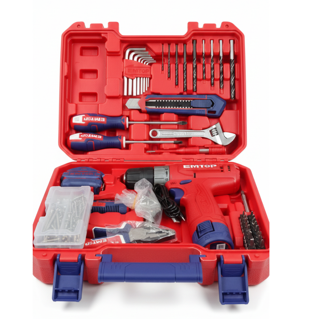 parafusadeira e fur. emtop 3/8" c/bat 12v+ c/129pç
