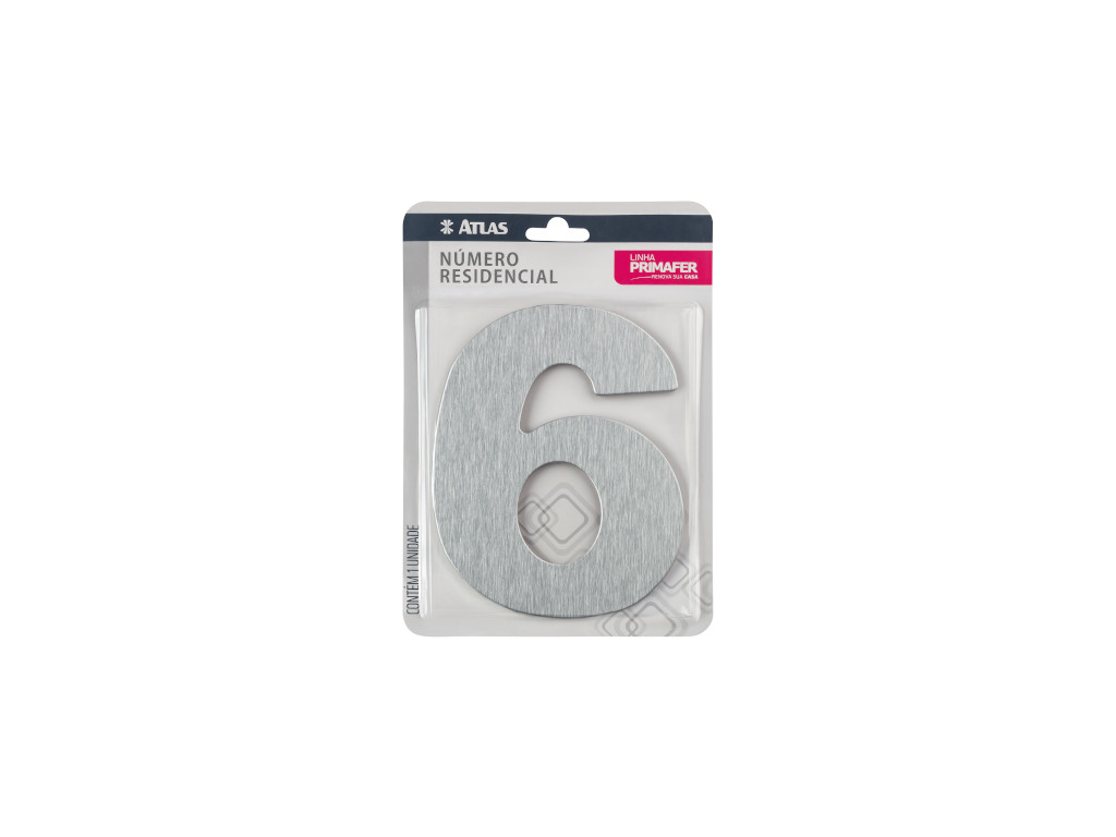 Número decorativo da Primafer, modelo N°6, em alumínio escovado. Produto autocolante de fácil instalação em ambientes externos e internos.