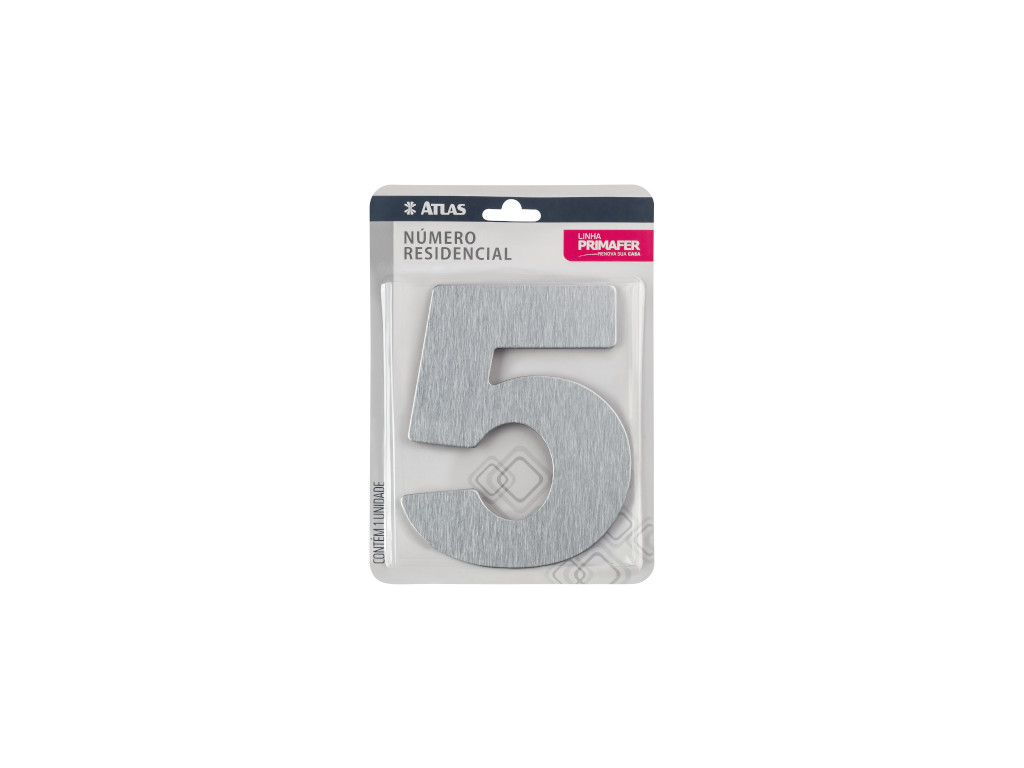 Número para imóveis da Primafer, modelo N°5, produzido em alumínio escovado com adesivo. Instalação rápida, indicado para entradas, portões e fachadas.