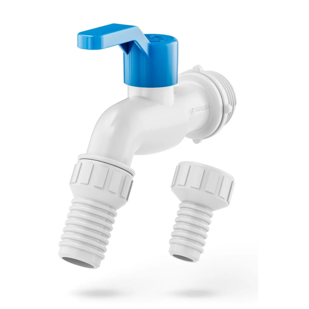 A Torneira Esfera Krona Jardim Branca 3/4" x 1/2" é fabricada em material resistente, ideal para uso externo em áreas de irrigação. Proporciona vedação eficaz e fácil manuseio.