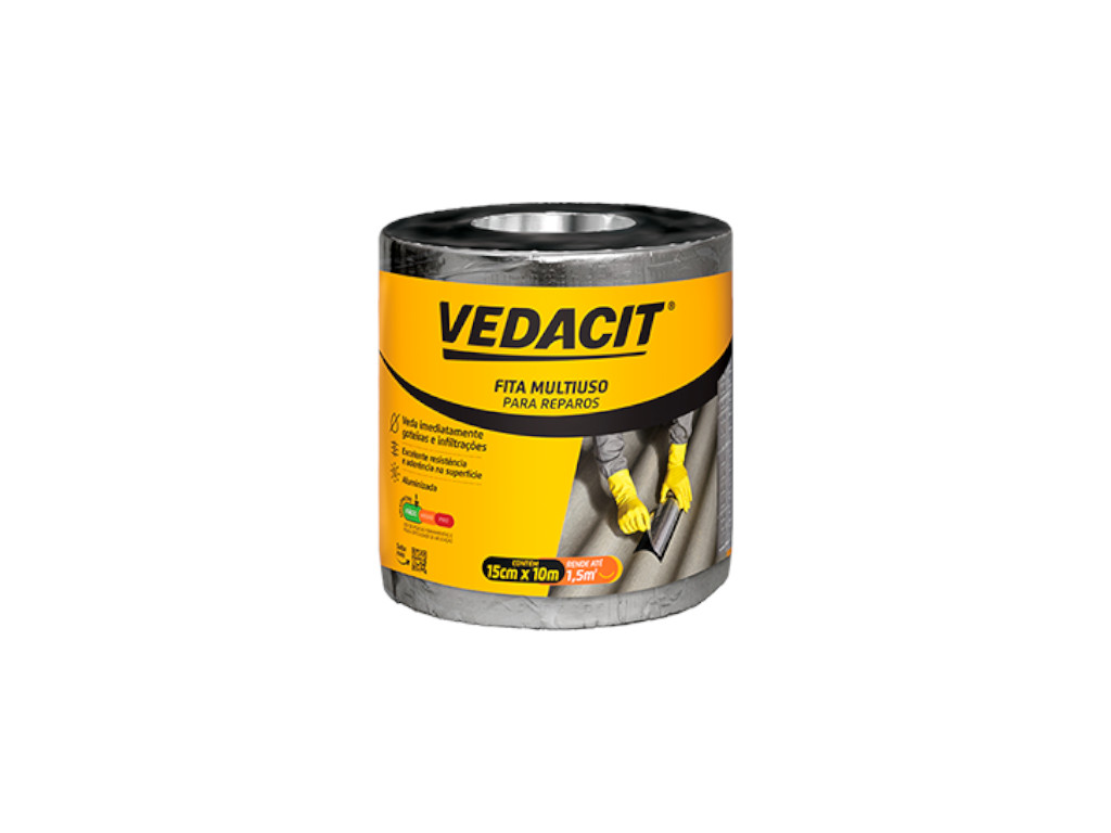 A Fita Multiuso Alumínio 10m x 15cm Vedacit Pro é indicada para reparos, vedações e reforços em superfícies sujeitas a infiltrações e variações climáticas. Produzida em alumínio flexível com adesivo de alto desempenho, garante vedação eficaz e resistência contra chuva, sol e mudanças de temperatura.