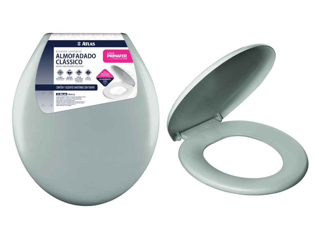 O Assento Almofadado Atlas Cinza é ideal para banheiros com tons neutros. Produto confortável, com boa aceitação em lojas que trabalham com mix variado de cores.