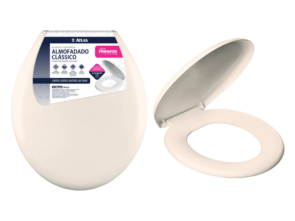 O Assento Almofadado Atlas Bege 1063/06 combina visual sofisticado com conforto. Ideal para banheiros modernos, sendo uma boa opção para revendas com linha diferenciada.
