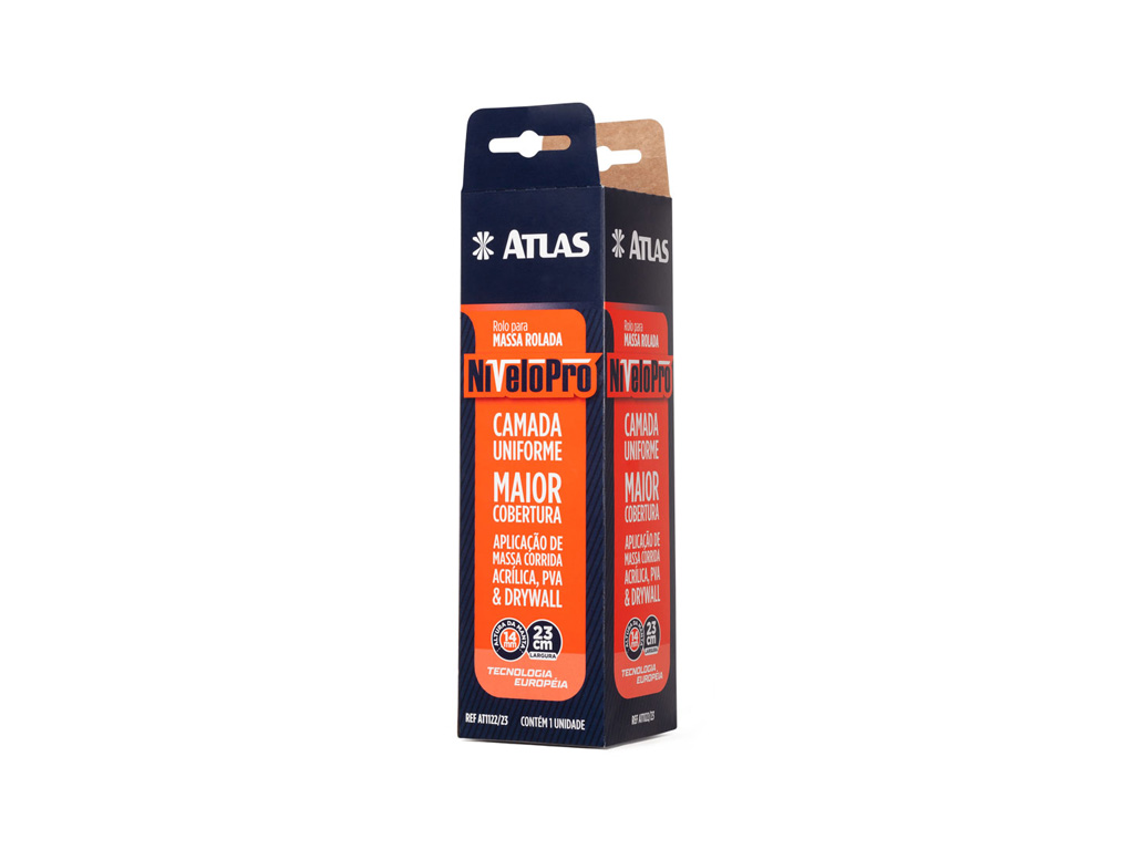 Rolo de pintura da linha Nivelopro, marca Atlas, com 23cm. Desenvolvido especialmente para aplicação de massas e texturas, garantindo acabamento uniforme e sem marcas.