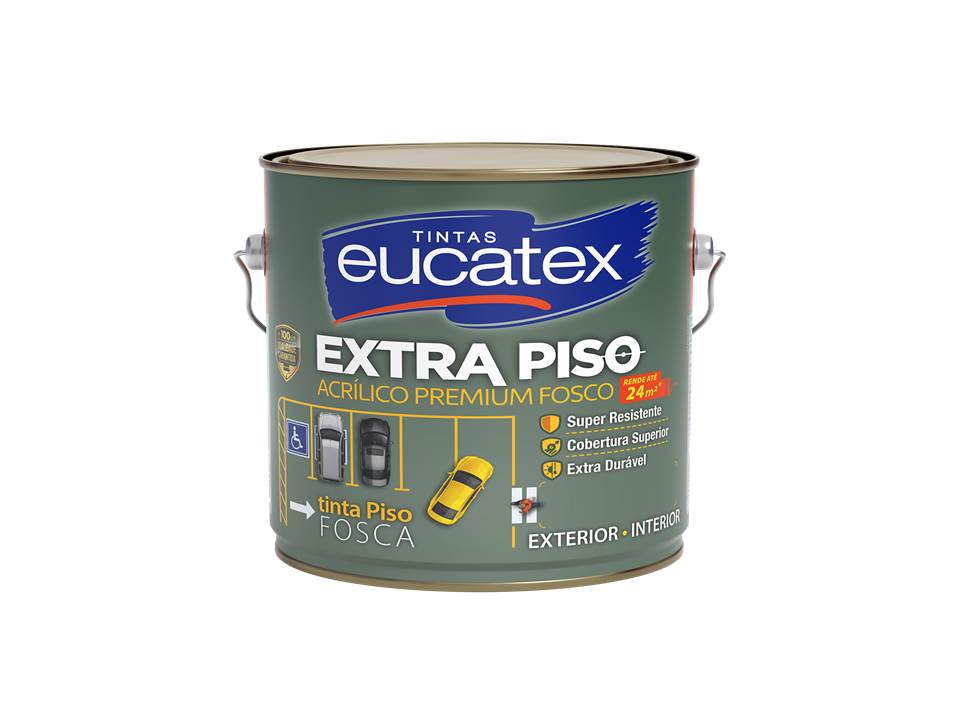 Tinta Eucatex para piso, embalagem de 3,6 litros, cor branca. Ideal para ambientes internos como garagens e depósitos. Acabamento fosco com resistência ao tráfego leve.